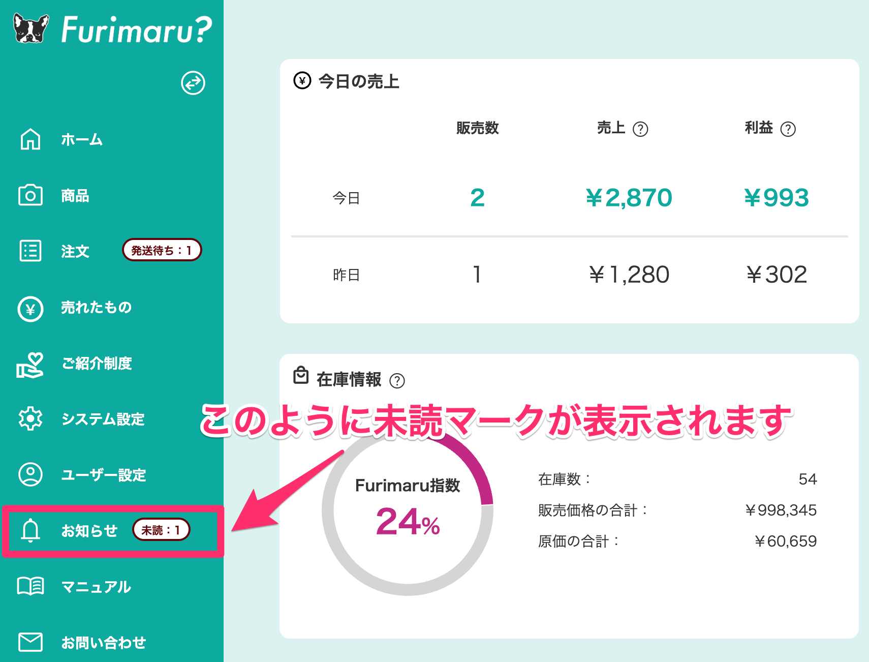 新しいお知らせが配信されると、メニューに未読のバッチが表示されます。