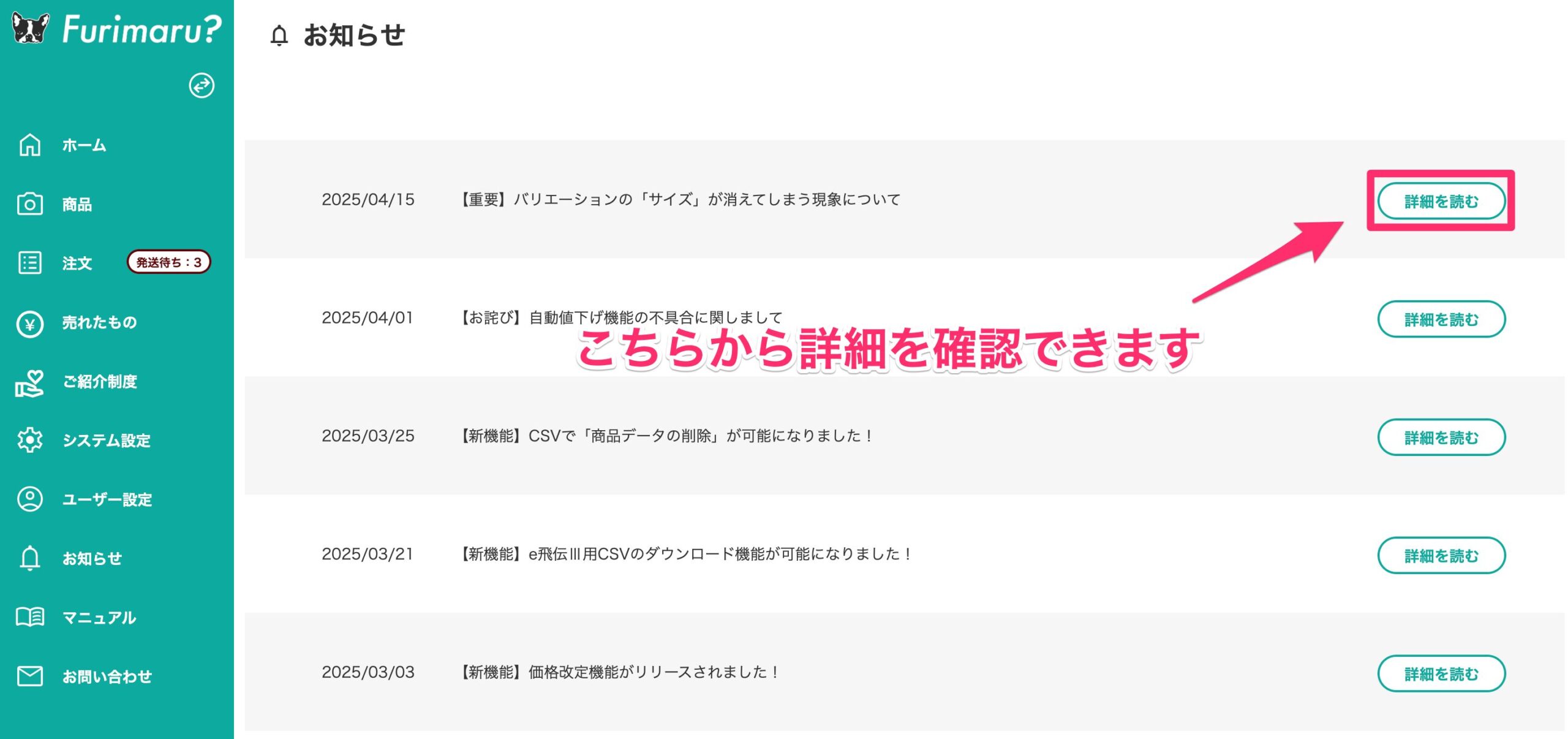 お知らせ画面では、Furimaruに関する最新の情報・システムメンテナンスの予定などの重要な通知が表示されます。